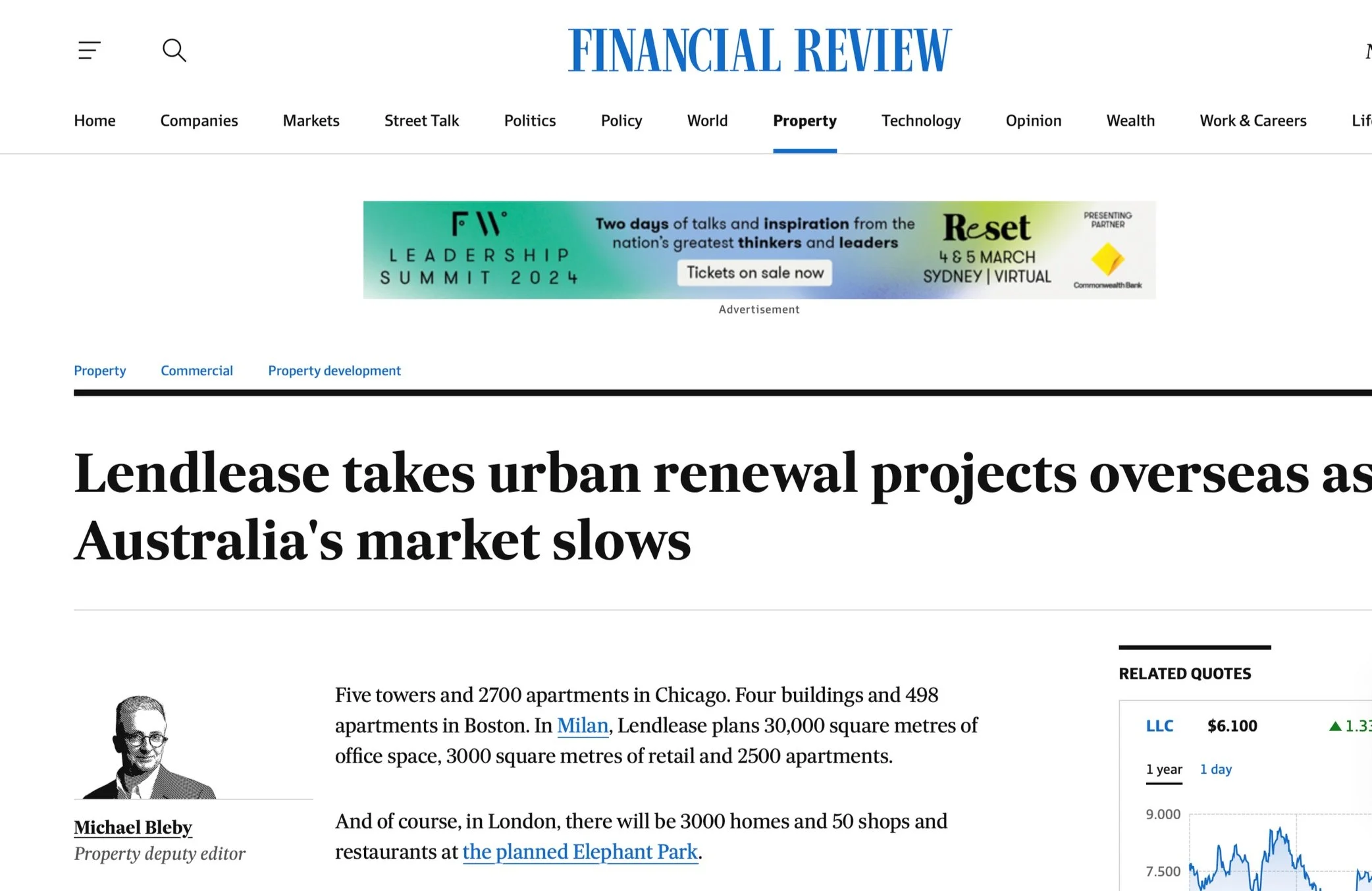 Lendlease takes urban renewal projects overseas as Australia's market slows